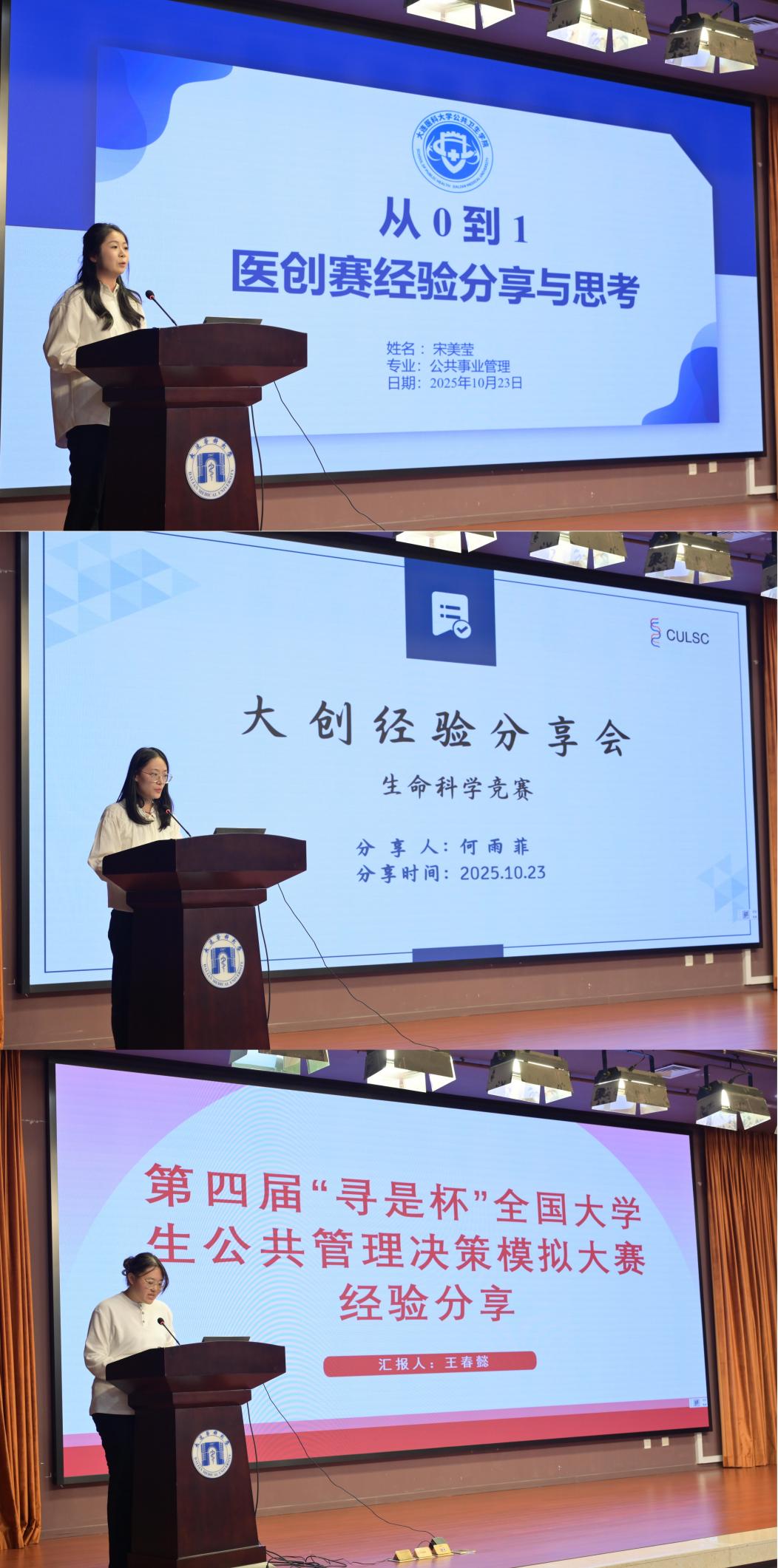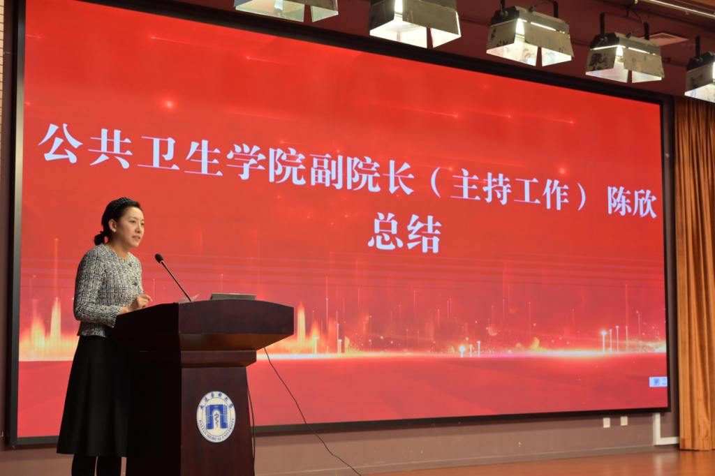 学生代表宋美莹、何雨菲、王春懿、刘思彤、安重瑾上台分享了参赛经历与感悟,展现了公共卫生学子勇于探索、敢于突破的风采。