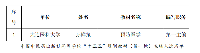 根据中国中医药出版社高等学校“十五五”规划教材(第一批)编者遴选工作安排,经学院申报、学校推荐、专家评审等相关程序,我院孙鲜策教授遴选为中国中医药出版社《预防医学》规划教材第一主编。